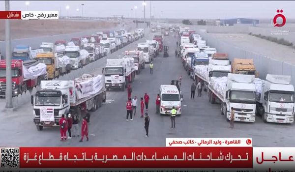 Menurut wartawan Al Qahera dari lokasi, puluhan trak yang membawa bertan-tan bantuan kemanusiaan sedang menuju ke lintasan Karam Abu Salem di selatan Gaza.